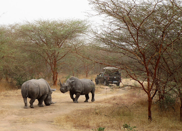 There was another Baobab that had been a burial site for the local griots (the history keepers/storytellers of African tradition), with bones visible still! Lots more ostriches and giraffes, then a family of warthogs, which were cool to see but too far to photograph. Then we cross another safari truck whose guide tells our guide something in Wolof and the only word I understood was “rhinoceros” and our driver picks up some speed. We come around a corner and see a couple of other trucks stopped and then we see TWO rhinos fighting! Right in front of us! Apparently these are the crown jewels of the reserve, they only have those two (a male and female) and most people who do the safari don’t even get to see one of them.
